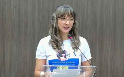 Ondina da Silva, presidente da Associação Amo Down, em discurso na Câmara de Campo Mourão, nesta segunda-feira. O uso da “Palavra Livre” foi para marcar o Dia Internacional da Síndrome de Down (21 de março).