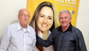 O ex-prefeito de Roncador, Augusto Becher, visitou nesta terça-feira no escritório regional da deputada Marla Tureck, em Campo Mourão. Ele esteve à frente do executivo roncadorense por três mandatos (65-69, 73/77 e 83/87). Como Marla estava em Curitiba, Becher foi recebido pelo ex-prefeito e presidente do PSD de Campo Mourão, Nelson Tureck. A deputada apareceu no cartaz ao fundo. Ah, presença de espírito...