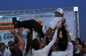 Seu Enoque Lourenço, o sempre presidente do América de Campo Mourão, é jogado ao alto pelos jogadores durante as comemorações do inédito título de campeão do Amadorzão, neste domingo. O time venceu o Iretama, nos pênaltis, por 5 a 4, depois de vitória no tempo normal por 2 a 1. E como se diz nos States, “Deus salve ‘o’ América!”...