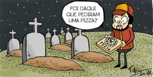Os membros da comissão não gostaram nem de uma charge de Tiago Silva publicada no jornal “Correio do Cidadão”, mostrando entrega de pizza no cemitério (veja acima).