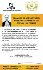 A Associação dos Juízes Federais do Paraná e a Academia Paranaense de Letras Jurídicas abriram inscrições para um concurso em homenagem ao ex-prefeito Milton Luiz Pereira (63/67).