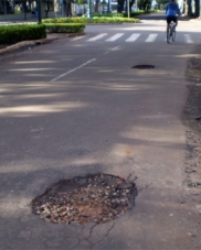 “Lamentavelmente, além dos cortes feitos no asfalto, há buracos muito perigosos. Estes dois buracos estão na av. Manoel Mendes de Camargo, esquina coma a rua Mato Grosso”. Fraterno Maria Nunes