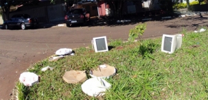 Na entrada do conjunto Capricórnio, monitores de computador e caixas de pizza ‘enfeitam’ o canteiro central. Até parece que o bairro está sendo “monitorado”. A foto é de Irineu Ricardo.