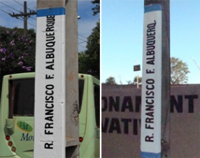 Os nomes das ruas de Campo Mourão estão sendo repintados nos postes. Isso é bom. Na rua Francisco Albuquerque, o fundo branco ficou pequeno e a sílaba final acabou "encavalada". Em outro poste, o nome foi abreviado: “Albuquerq.” E tá criado o “jeitinho mourãoense”...