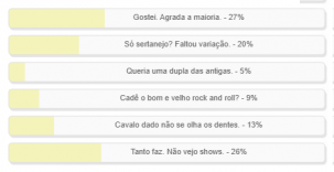 “O que achou dos shows anunciados para a Festa do Carneiro no Buraco?” Enquete encerrada neste domingo deu vitória à alternativa “Gostei. Agrada a maioria”, com 27% dos votos. Mas foi apertado. “Tanto faz. Não vejo shows” teve 26%. “Só sertanejo? Faltou variação” fechou o pódio com 20%. O resultado completo está no quadro acima.