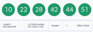 Ninguém acertou as seis dezenas da Mega Sena que foram sorteadas o último sábado. Assim, o prêmio segue acumulado e deve chegar a R$ 40 milhões no sorteio desta terça-feira. A quina teve 56 apostas ganhadoras sendo que apenas uma delas é do Paraná. De onde? De onde? De onde? De Campo Mourão! Foi feita na lotérica Mina de Ouro e faturou R$ 65,1 mil.