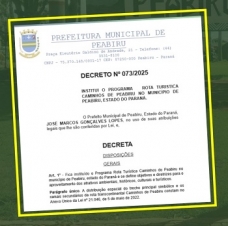O prefeito de Peabiru, Marcos Lopes, assinou decreto que institui no município o programa Rota Turística Caminhos de Peabiru. O texto tem como base a lei estadual de 2022 que declara os Caminhos de Peabiru como Rota Turística no Estado do Paraná. Também leva em consideração a importância histórica, cultural e ambiental dos Caminhos de Peabiru. No governo estadual, o programa está sendo implantado por meio das secretarias de Planejamento e do Turismo.
