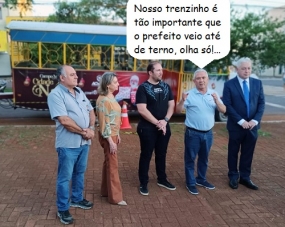 O clic é do final da tarde desta quinta-feira, quando começou a funcionar o trenzinho de Natal da Acicam. O primeiro passeio pelo centro de Campo Mourão incluiu entre os “passageiros” o prefeito Douglas Fabrício (de terno e gravata) e o presidente da Acicam, Francisco Viudes.
