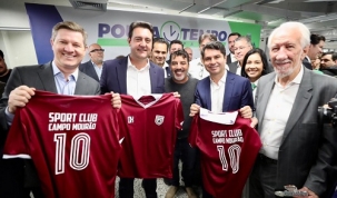 O que o governador Ratinho Jr, o presidente do Detran, Santin Roveda, e o presidente da Assembleia Legislativa, Alexandre Curi, estão fazendo com a camisa do Sport Campo Mourão? Ganharam de representante da Associação Anibal Khoury. Foi nesta terça-feira, em Curitiba, durante a inauguração do primeiro Poupatempo Paraná. Campo Mourão terá uma unidade no ano que vem.