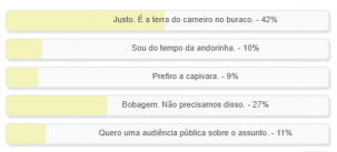 “A prefeitura de Campo Mourão quer oficializar o carneiro como mascote da cidade. O que você acha?” Enquete com esta pergunta foi encerrada neste domingo. Vitória da alternativa “Justo. É a terra do carneiro no buraco”, com 42% dos votos. “Bobagem. Não precisamos disso” ficou em segundo, com 27%. “Quero uma audiência pública sobre o assunto” completou o pódio, com 11%. O resultado completo está no quadro acima.