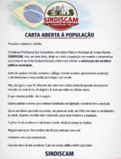 Sindiscam, em “Carta Aberta” divulgada pelas redes sociais, sobre a greve dos servidores municipais de Campo Mourão que está marcada para começar na próxima terça-feira. A categoria pede 5% de reajuste (4% já e 1% em junho) e a administração oferece 4%.
