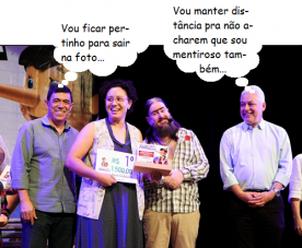 O clic é da hora da premiação do 31º Concurso Pinóquio de Causos e Mentiras, no Teatro Municipal de Campo Mourão. Ana Paula Soares Rola recebe o prêmio de “maior mentira” das mãos do humorista Chico da Tiana. O vereador Sidnei Jardim e o prefeito Douglas Fabrício prestigiaram o evento...