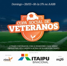 Acontece neste domingo, na AABB, em Campo Mourão, a Copa Social de Veteranos, promovida pela Associação Fênix Social de Campo Mourão, com patrocínio da Itaipu Binacional. A competição reunirá oito equipes de futebol suíço, que receberão uniformes produzidos exclusivamente para o torneio, bolas e medalhas, além de troféus para os três primeiros colocados.