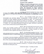 O prefeito de Campina da Lagoa, Padre Gianny, sancionou a lei que dá 10% de reajuste aos servidores da Câmara.