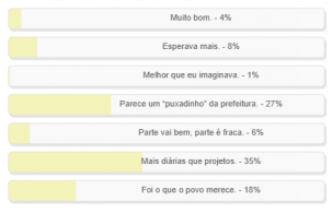 “Como foi o 1º ano dos vereadores de sua cidade?” Enquete encerrada neste domingo deu vitória à alternativa “Mais diárias que projetos”, com 35% dos votos. Que maldade! “Parece um puxadinho da prefeitura” ficou em segundo, com 27% (olha, a maldade outra vez!). “Foi o que o povo merece” fechou o pódio, com 18%. O resultado completo está no quadro acima.