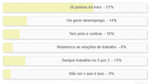 “O que você acha da proposta do fim da escala de trabalho 6 por 1?” Enquete encerrada neste domingo deu vitória, com folga, à alternativa “Já passou da hora”, com 51% dos votos. “Vai gerar desemprego” ficou em segundo, com 14%. “Sempre trabalhei no 5 por 2” teve 13%. O resultado completo está no quadro acima.