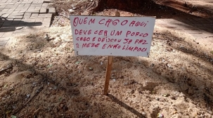 Olha a placa colocada em monte de areia no calçadão, no centro de Campo Mourão.