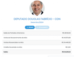Douglas Fabrício virou prefeito de Campo Mourão e deixou de ser deputado estadual, certo? Mas como foram as despesas dele, em dezembro, na Assembleia Legislativa? Bem, Douglas tinha direito a R$ 40,5 mil e utilizou R$ 34,4 mil. Como já vinha com sobras de R$ 28,1 mil, fechou o ano com R$ 34,2 mil no caixa, dinheiro que voltou para os cofres do executivo.