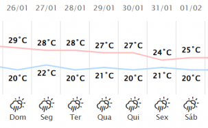 Tá calor, né? Pela previsão do Simepar, a temperatura em Campo Mourão dá uma amenizadinha a partir deste domingo, quando a máxima fica em 29 graus. Na sexta cai para 24 graus (a máxima!). O Simepar também prevê chuva todos os dias da semana. Começa com 3 mm no domingo e chega a 14 mm na sexta-feira.