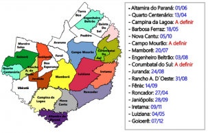 O IDR atualizou nesta quarta-feira o calendário anual regional das caminhadas internacionais na natureza. Foram incluídos mais quatro municípios. Eram 13, foi para 17. Um os quatro é Campo Mourão, com data ainda a ser definida. Os outros três são Iretama, Nova Cantu e Rancho Alegre do Oeste. A primeira caminhada do ano segue sendo a de Quarto Centenário, marcada para 13 de abril.