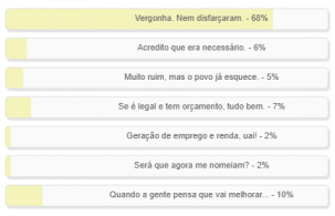 “O que você achou da Câmara de Campo Mourão criar cargos e aumentar salário de assessores logo no primeiro mês de mandato?” Enquete encerrada neste domingo deu vitória à alternativa “Vergonha. Nem disfarçaram”, com 68% dos votos. Em segundo ficou “Quando a gente pensa que vai melhorar...”, com 10%. “Se é legal e tem orçamento, tudo bem”, completou o pódio, com 7%. O resultado completo está no quadro acima.