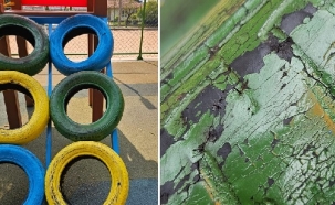 O pneu verde deste brinquedo, na praça do Fórum, está com arames expostos. Antes que alguma criança se machuque, seria apropriado substitui-lo.