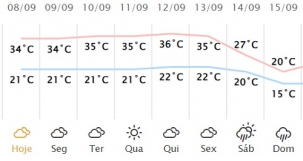 Os termômetros devem chegar aos 34 graus neste domingo, em Campo Mourão, segundo a previsão do Simepar. E será a temperatura mais baixa até sexta-feira. Somente no sábado o calorão começa a diminuir e a máxima fica nos 27 graus. No próximo domingo chove e os termômetros não passam dos 20 graus, com mínima de 15.