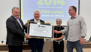 O deputado Douglas Fabrício, prefeito eleito de Campo Mourão, recebeu nesta quinta-feira à noite o título de Cidadão Honorário de Ubiratã. A homenagem partiu da vereadora e primeira-dama Luciane D’Alécio, que fez a entrega ao lado do prefeito-marido Fábio D’Alécio e do vice-prefeito Alexandre Molina. O prefeito de Campo Mourão, Tauillo Tezelli, prestigiou a sessão solene.