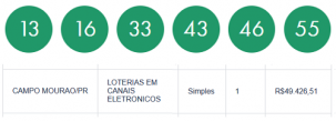 Uma aposta feita em Cuiabá/MT foi a única que acertou as seis dezenas da Mega Sena sorteadas neste sábado. Vai levar para casa R$ 201 milhões. A quina teve 242 apostas ganhadores e cada uma faturou R$ 49,4 mil. Quatorze delas são do Paraná, sendo uma de Campo Mourão, realizada através de canais eletrônicos.
