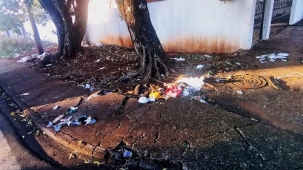 Lixo espalhado pela calçada na esquina entre av. Jorge Walter e rua Laurindo Borges.
