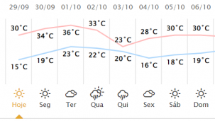 A semana vai começar com muito calor em Campo Mourão. Segundo o Simepar, os termômetros chegam a 34 graus na segunda e a 36 na terça-feira. Na quinta chove (11,3 mm) e a máxima fica em 33 graus. Na sexta chove mais (27,6 mm) e a temperatura máxima despenca para 23 graus. A mínima chega a 16 graus na sexta.