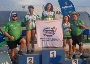 Foto histórica nos Jogos da Juventude do Paraná, que estão sendo disputados em Campo Mourão. No pódio do lançamento do martelo feminino, só deu atleta mourãoense. Ouro para Jade Vieira (recorde dos Jojup’s), prata para Maria Ruth e bronze para Letícia Dominelli.