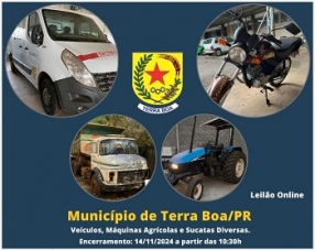 Terra Boa – A prefeitura abriu leilão online de veículos, máquinas agrícolas e sucatas. Lances podem ser feitos até às 10h30 do próximo dia 14. Onde? www.andreluizleiloes.com.br.