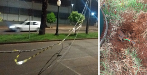 “Madrugada agitada. Caminhão quebra poste de padrão da Copel no arrastão e vândalos furtam fiação elétrica. Tudo na mesma quadra em frente à escola Gurilândia.