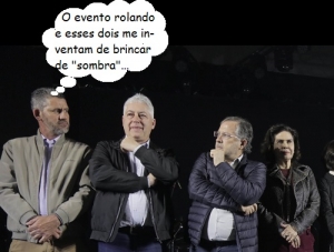 O clic é desta sexta-feira, na hora da abertura oficial da Festa Nacional do Carneiro no Buraco, na praça São José, em Campo Mourão. O vereador Jadir Pepita observa o deputado Douglas Fabrício e o prefeito Tauillo Tezelli, que fazem a mesma pose.