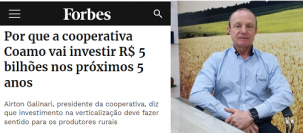 A matéria destaca que a Coamo investe, de R$ 700 milhões a R$ 1 bilhão por ano.