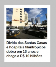 Em 2005, as dívidas das santas casas e dos hospitais filantrópicos de todo o Pais somavam R$ 5 bilhões (valores já atualizados). Hoje dobrou e chega a R$ 10 bilhões. Esse é o tema de matéria publicada com destaque, neste domingo, no portal UOL. No estado de São Paulo existem 409 santas casas e 46 delas estão sob intervenção administrativa. Em Campo Mourão, a dívida da Santa Casa já se aproxima de R$ 60 milhões.
