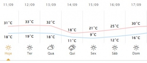 O Simepar está prevendo muito calor neste início de semana em Campo Mourão. Chega a 33 graus na terça-feira. A máxima, no entanto, deve cair a 18 graus na quinta, quando chove e fica nublado. No fim de semana esquenta de novo e os termômetros voltam à casa dos 30 graus. A partir daí, se a previsão não mudar, o calorão vem com tudo. Vai a 37 graus no dia 21 e chega a 40 (isso mesmo: qua-ren-ta!) no dia 25. Haja ventilador...