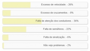 "Qual é o principal problema do trânsito de Campo Mourão?" Enquete encerrada neste domingo deu vitória à alternativa "Falta de atenção dos motoristas", com 36% dos votos. "Excesso de velocidade" teve 26% e, "falta de semáforos", 22%. O resultado completo está no quadro acima.