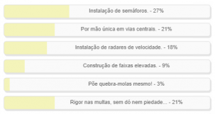 "Qual a prioridade para o trânsito de Campo Mourão?" Enquete encerrada neste domingo deu vitória à alternativa "Instalação de semáforos", com 27% dos votos. Em segundo lugar, duas alternativas com 21% - "Por mão única em vias centrais" e "Rigor nas multas, sem dó nem piedade". A instalação de radares de velocidade teve 18%. O resultado completo está no quadro acima.
