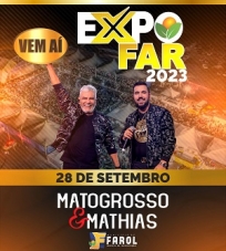 A dupla Matogrosso & Mathias vai abrir a Expofar deste ano. O show foi o primeiro a ser anunciado na programação da Feira Agroindustrial de Farol, que será realizada de 28 a 30 de setembro. O evento faz parte das comemorações pelo Jubileu de Pérola (30 anos) do município. Além de shows artísticos, haverá rodeio, tudo com entrada franca.
