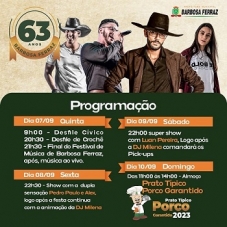 Saiu a programação de aniversário de 63 anos de Barbosa Ferraz. Será de 7 a 10 de setembro, incluindo shows com Pedro Paulo & Alex (dia 8) e Luan Pereira (dia 9). No encerramente acontece a Festa do Porco Garantido, o prato típico do município. A programação também contará, na abertura, com desfile de crochê, afinal, Barbosa Ferraz é, por lei, a capital paranaense do crochê.