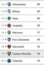 O Umuarama tem 20 pontos, e é o 12º colocado.