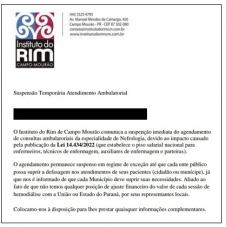 O Instituto do Rim de Campo Mourão suspendeu o agendamento de consultas ambulatoriais de nefrologia.