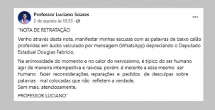 O ex-vereador e ex-candidato a prefeito de Barbosa Ferraz, Luciano Soares, publicou "Nota de retratação" nas redes sociais. Foi por causa de ofensas que fez contra o deputado Douglas Fabrício em áudio no Whatsapp. Ele disse que agiu de "maneira raivosa" no "calor do nervosismo" e pediu desculpas. A retratação faz parte de acordo judicial em que Soares também se comprometeu a repassar cinco cestas básicas de R$ 300 para a prefeitura de Barbosa Ferraz.