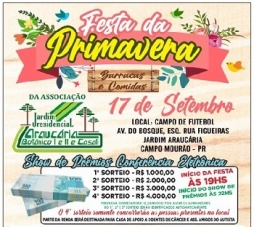 A Associação de Moradores do Jardim Araucária vai realizar a Festa da Primavera. Será no campo de futebol, no dia 17 de setembro. Inclui show de prêmios com sorteio de R$ 10 mil em dinheiro, sendo R$ 4 mil para o primeiro prêmio. As cartelas estão à venda por R$ 20. Moradores do bairro foram convidados a ajudar nas vendas. A cada 10 cartelas vendidas, o morador/vendedor ganha uma. Parte da renda vai para a Casa de Apoio aos Doentes de Câncer, e para a Associação de Amigos dos Autistas, de Campo Mourão.