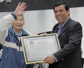 A Câmara de Campo Mourão realizou sessão solene nesta quinta-feira. Foi para a entrega do título de Cidadania Honorária ao professor de judô Shigueru Matsumi, de 88 anos. A homenagem tinha sido aprovada ainda na legislatura anterior, em iniciativa do então vereador Sidnei Jardim. Entre os presentes, que lotaram o plenário, familiares, amigos e ex-alunos de Matsumi.