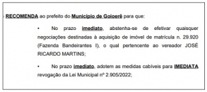 A recomendação cita, entre outras coisas, que vereadores estão proibidos de fazer negócios com a administração pública.