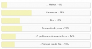 "Com os pré-candidatos a deputados que a região tem, o futuro regional será..." Enquete com esta questão foi encerrada neste domingo. Venceu a alternativa "...na mesma", com 29% dos votos. Para 20% "...tá na mão do povo" e para 18% vai ficar "pior". Só 6% acham que ficará "melhor". O resultado completo está no quadro acima.