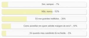 "Você acredita nas pesquisas eleitorais?" Enquete encerrrada neste domingo deu vitória à alternativa "Não, nunca", com 52% dos votos. Primeiro turno! "Só nos grandes institutos" ficou em segundo com metade da votação (26%). Quem acredita "sempre" somou apenas 7%, enquanto 5% admitiu que só acredita quando seu candidato está na frente. O resultado completo está no quadro acima.